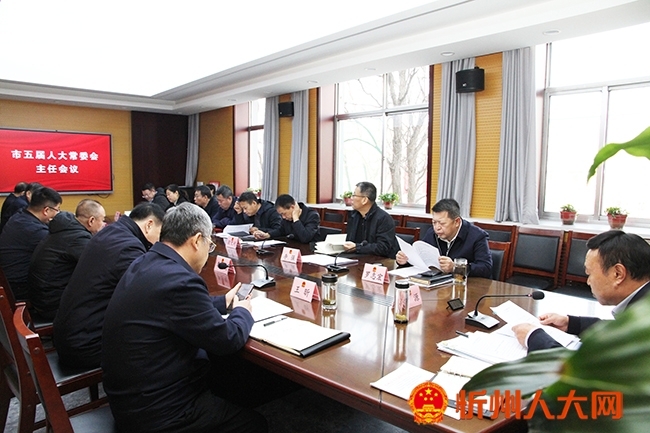 会议听取了市五届人大常委会第三十一次会议建议议程、日程的汇报;听取了市五届人大常委会第三十次会议形成的关于《2024年度市级国有自然资源资产管理情况专项报告》的审议意见、关于整治群众身边不正之风和腐败问题工作情况报告的审议意见、关于《忻州市滹沱河流域生态修复与保护条例》执法检查报告的审议意见、关于全市对外经济工作情况报告的审议意见的汇报;听取了市人民政府关于2025年市本级预算调整方案(草案)报告和预算工委审查结果报告、关于2024年市本级预算执行和其他财政收支审计查出问题整改情况的报告和预算工委督查报告、关于全市乡村振兴工作情况的报告、关于全市安全生产情况的报告、关于科技创新工作情况的报告及市人大调研报告准备情况的汇报;听取了市人大常委会关于安全生产“一法一条例”执法检查报告准备情况的汇报;听取了市中级人民法院关于全市法院深入推进矛盾纠纷多元化解工作情况的报告准备情况的汇报;听取了规范性文件备案审查工作情况的报告准备情况的汇报;听取了市五届人大五次会议代表建议办理情况报告准备情况的汇报;听取了忻州市人民代表大会常务委员会关于召开忻州市第五届人民代表大会第六次会议的决定(草案)的汇报;听取了市五届人大常委会2026年立法计划(草案)及市人大常委会立法后评估办法(草案)的汇报;听取了人事任免事项的汇报,并对相关内容进行了讨论研究。